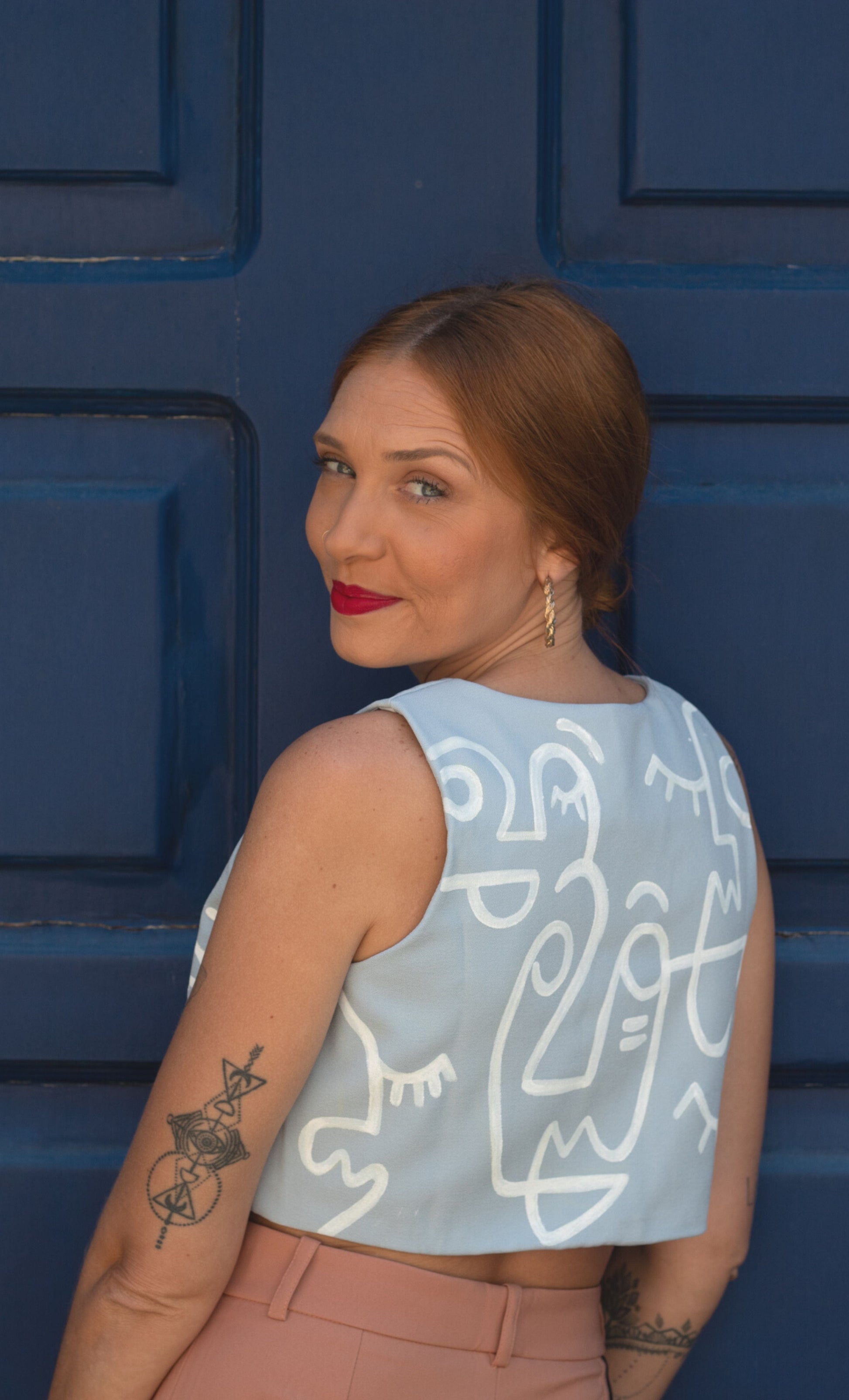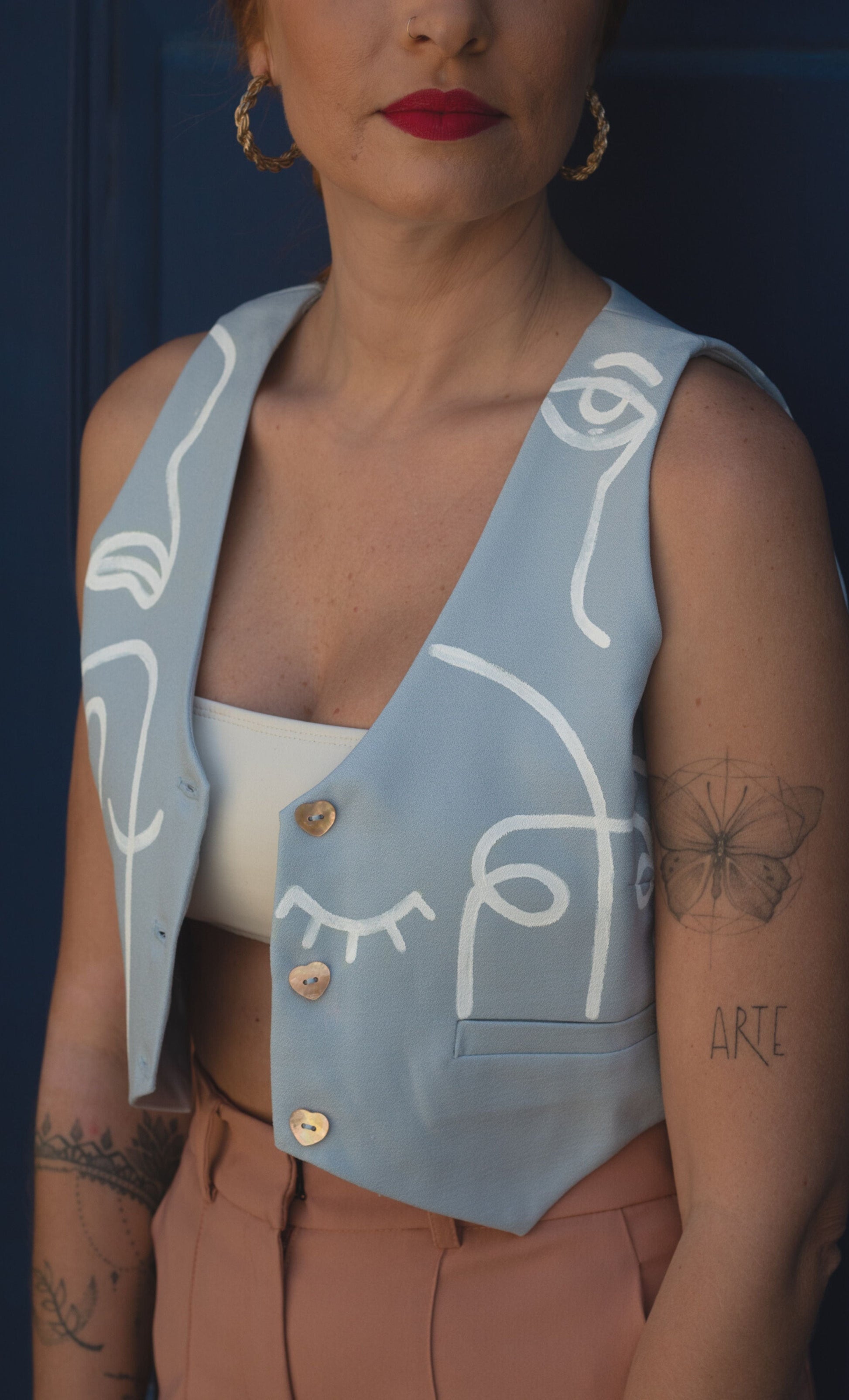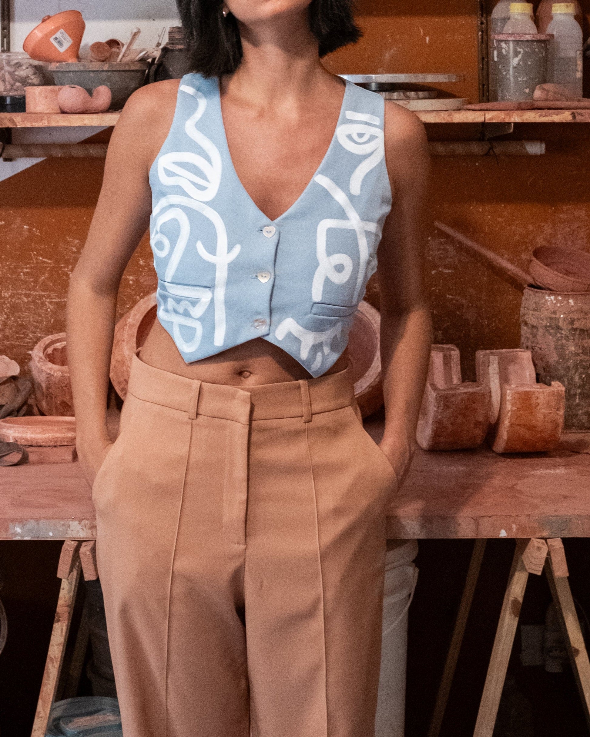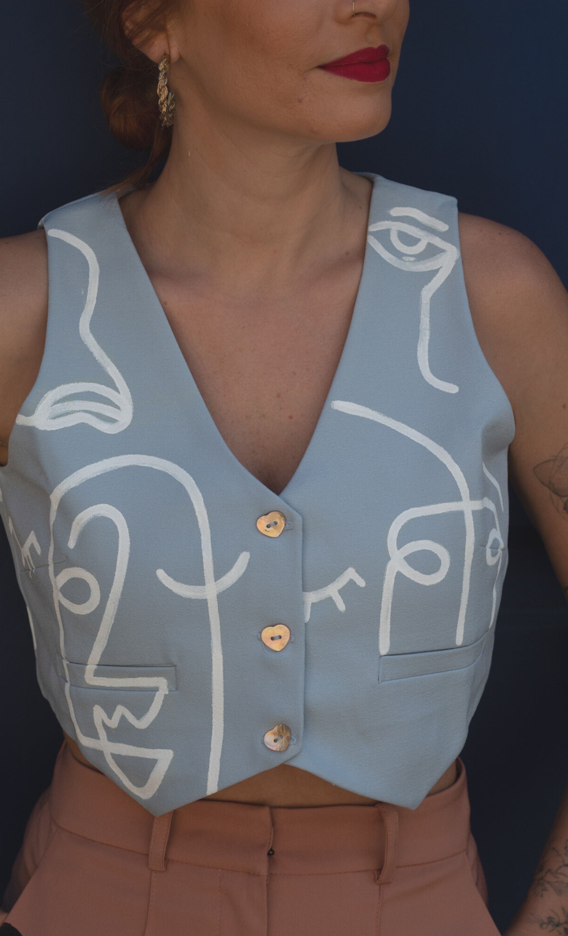 Colete alfaiataria cropped, na cor azul nuvem, com estampa pintada a mão em branco com tinta própria para tecido. Fechamento frontal com nossos fofos botões de coração em madre pérola. Possui forro leve, para dar estrutura a peça.