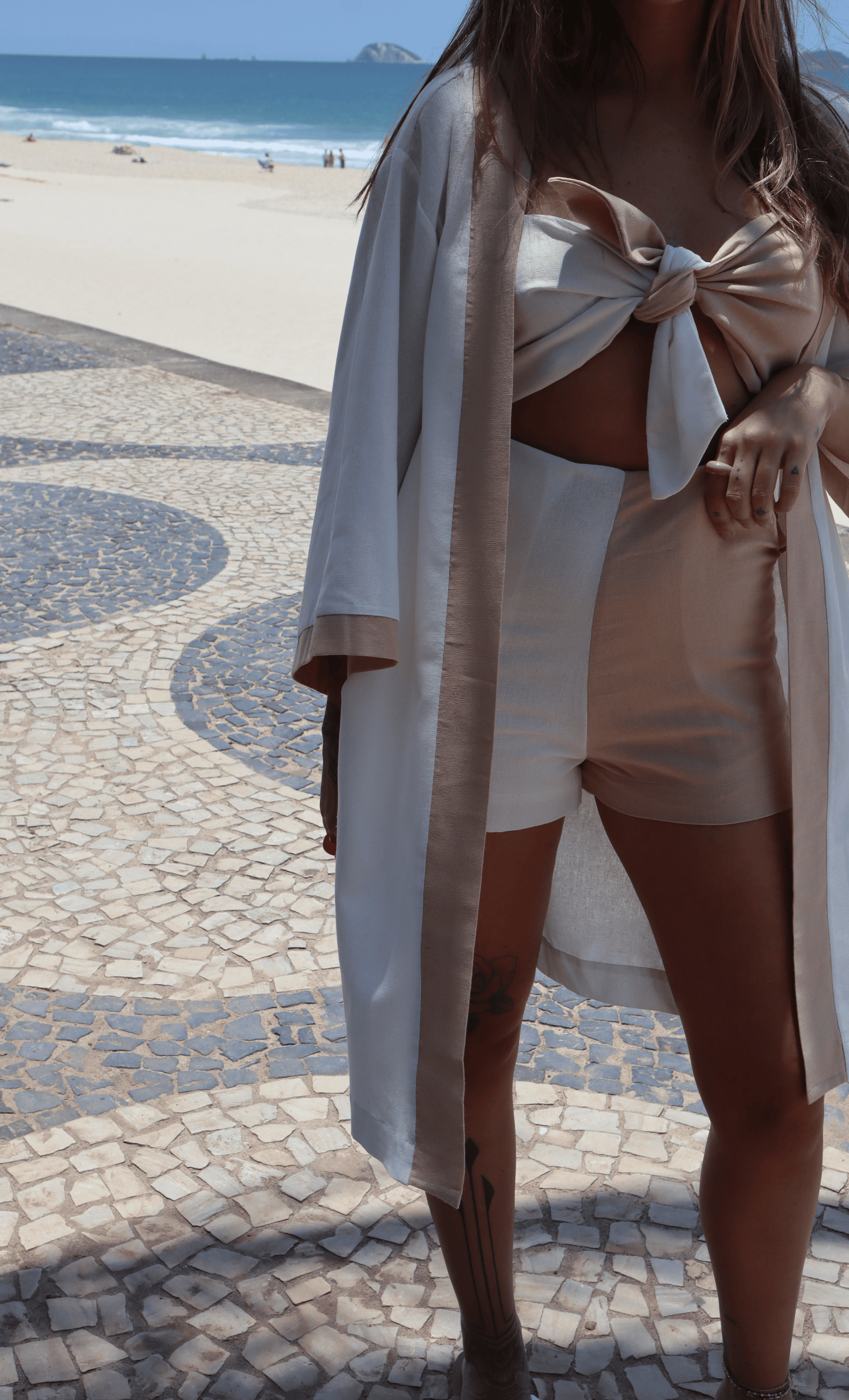 Acompanha faixa para amarrar na cintura, permitindo também o uso como vestido. Um visual leve, fluido e cheio de possibilidades – exatamente como os finais de tarde no Rio.